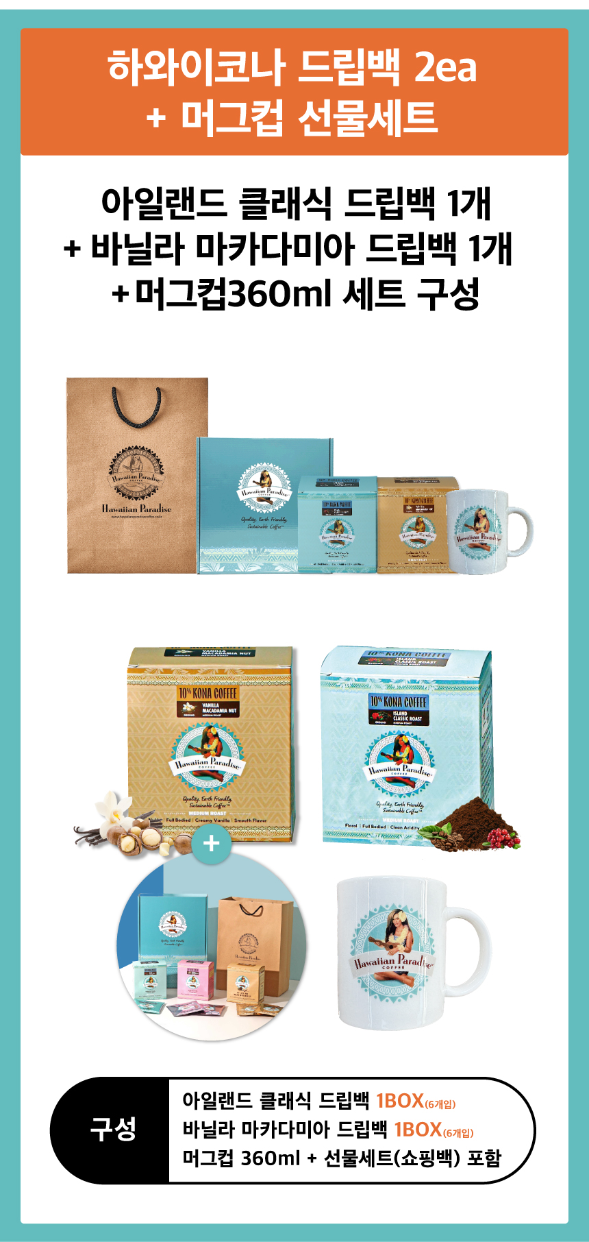 [선물세트]아일랜드 클래식,바닐라 마카다미아 드립백 + 머그컵 360ml 세트 [원산지:미국]